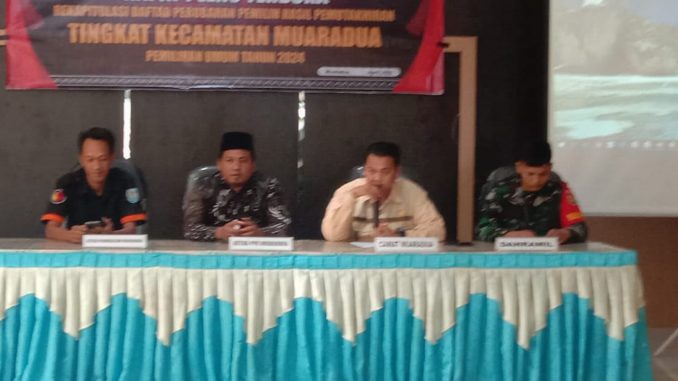 Kecamatan Muaradua Sekcam Roni Setia Budi ,SH,Mewakili Camat Muaradua dalam Menghadiri Kegiatan Rapat Pleno Terbuka Rekapitulasi Daptar Perubahan Pemilih Hasil Pemuktahiran Tingkat Kecamata Muaradua Pemilihan Umum Tahun 2024. Pada Hari Minggu 02 April Tahun 2023 di Aula Kantor Camat Muaradua dari Pukul 08.00 sampai dengan selesai Dalam sambutan Sekcam Muaradua Melalaui Tahapan awal Pemuktahiran Data ini akan berproses menjadi DPT dan tentunya diharapkan agar seluruh Masyarakat dalam Kecamatan Muaradua dapat terdata Keseluruhan guna menyalurkan Aspirasi nya dalam pemilihan Legeslatif dan pilpres Tahun 2024.
