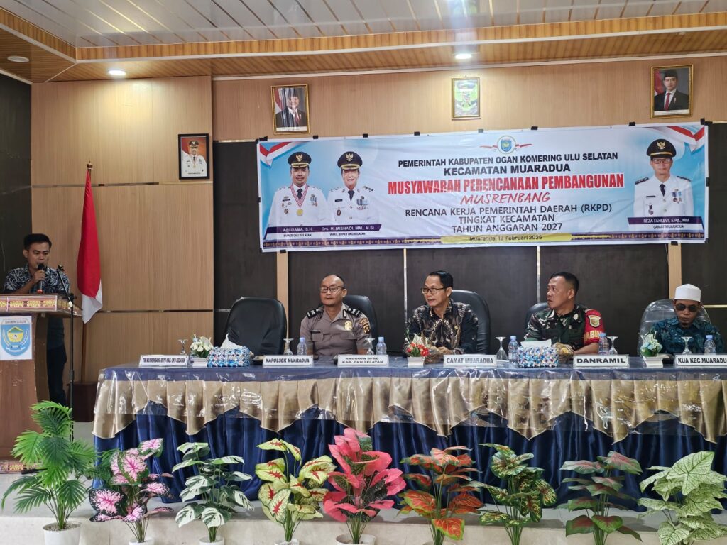 Pemerintah Kabupaten Ogan Koring Ulu Selatan Kecamatan Muaradua,Musyawarah Perencanaan Musrenbang,Rencana Kerja Pemerintah Daerah ( RKPD ) Tingkat Kecamatan Tahun Anggran 2027.yang dihadiri oleh Kepala Desa /Lurah,Kapolsek Muaradua,Danramil Muaradua,Keapa UPT Puskesmas Muaradua yang mewakili,Kepal KUA Muaradua,Kepala Dinas BAPPERINDA,Kepala Dinas PPAPPKB,Kepala Dinas PU yang mewakili,Kepala Dinas UPTD PPA,Pendamping Desa Muaradua,Tokoh Masyarakat,Tokoh Agama, di tempat Kantor Camat Muaradua,Kamis 12 Februari 2026
